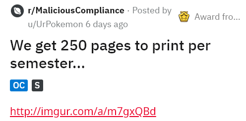 For whatever reason, almost every printing policy is stupid. Whether you work somewhere with one, or go to school, there's always some sort of wast-of-money plan that never seems to work out in your favor. There's even another dude who complied with his school's unfair printing fee by using every printer at once.