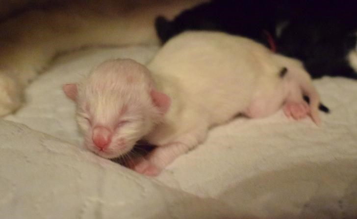 "At 4 weeks old you can see she is going to be odd-eyed if you squint really hard. Her right eye is getting lighter blue and left is darkening."