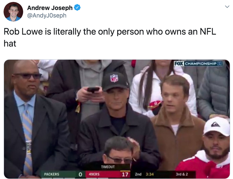 Rob Lowe did not anticipate the reaction he received on Twitter, over his NFL hat. People were quick to poke fun at the fact that the guy showed up to an NFL game, basically just rooting for the NFL. I guess at least Rob Lowe doesn't have to deal with alienating himself from any fans in particular. Based off his hat, his team would appear to be undecided.