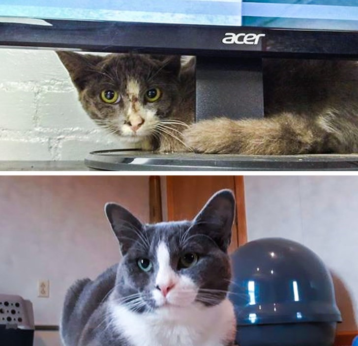 “We adopted this guy from a foster and rescue. He had patches of fur missing, noticeable scarring on his belly, and conjunctivitis. We hope he continues to flourish and live a happy, healthy life.”
