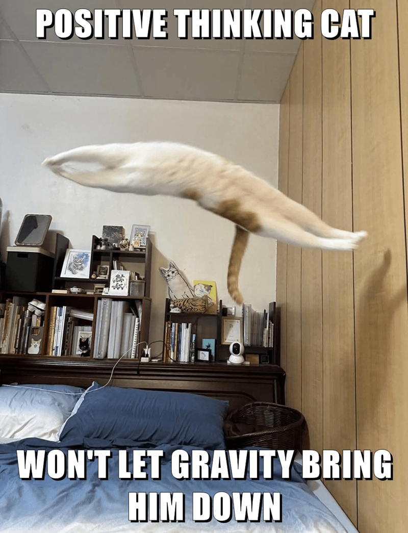 POSITIVE THINKING CAT WON'T LET GRAVITY BRING HIM DOWN