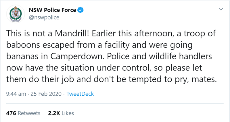 Several shocked witnesses called into local radio stations, sharing details on the sighting: "Mate, I'm dead set serious. I'm at RPA, I'm six floors up and I was just having a gaze out at the carpark … and there were three baboons in the carpark," the caller said. "I'm dead set serious. They even had shiny red bottoms."