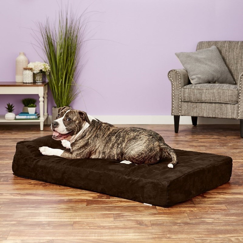 photo brown and white speckled dog lying on brown big barker orthopedic dog bed in room purple wall