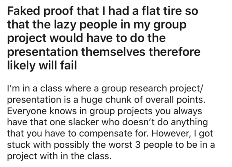This student decided to fake a flat tire so that their lazy classmates in the group project would fail. Just the kind of pro petty revenge that deserves some high marks.