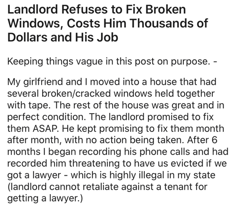 This landlord learned a humbling lesson in the power of addressing tenants and their concerns. If the landlord had just listened, and proceeded to fix the broken windows, so much money could've been saved. But no. No listening. Instead, the landlord ended up having to pay thousands of dollars, and a loss of a job factored in too.