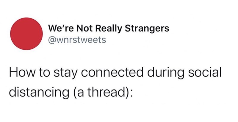 As citizens all over the world retreat to their spaces to flatten the Coronavirus curve, we're finding ourselves missing our usual forms of connection. Some of us can't see or touch our loved ones. The interactions we take for granted at the coffee shop or at a bar are now forbidden. Some people are finding ways around these restrictions: setting up conference call "raves" and video chatting as though enjoying a night out with friends. Even with these adaptive measures, it can be hard to feel "connected" during a crisis like this. But Twitter account @wnrstweets is here with tips on maintaining our humanity and connections while COVID-19 ravages our brains. Stay safe, people, and try to stay happy.
