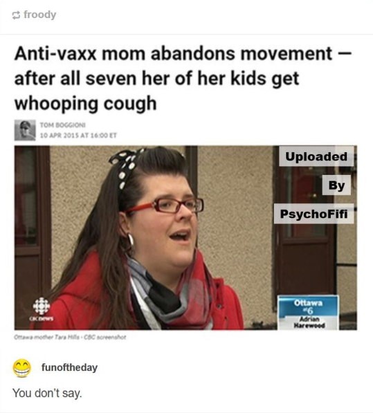 Tumblr provides context to the story of a formerly anti-vaxx mom who changed her mind after realizing that she was wrong. It's wild that it has to come to such extreme cases to change someone's mind, but the idea that critical thinking and research as a skill is important, and that people can get better at it is kinda cool. For some eye opening info, Here's a Tumblr thread that provides a lot of missing information about the reality of the McDonald's hot coffee case, or the time Tumblr users got schooled on physics and car safety.