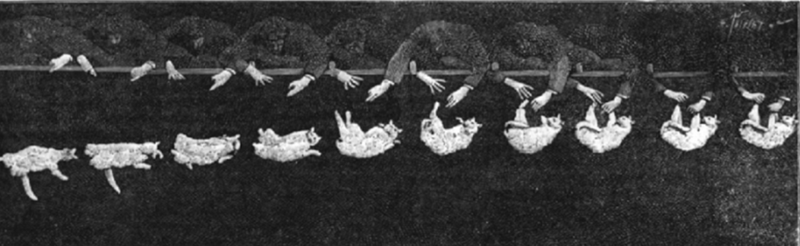 He used an anonymous white French cat and dropped it from an unspecified height in the Bois de Boulogne, filming its descent at 12 frames per second. The photos show how a cat falling, even with no rotational movement at the beginning of the decline, would gain momentum while in free fall. He even published these photos, along with his research, in a volume of Comptes Rendus in 1894.