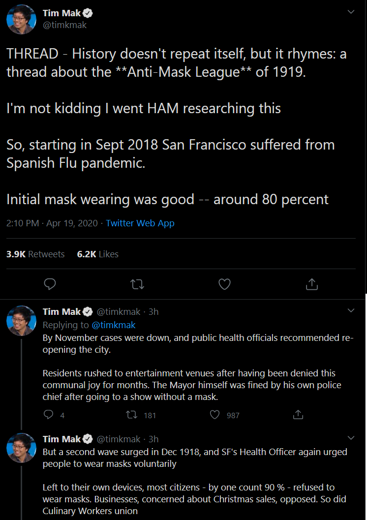 Journalist Tim Mak explains the time San Francisco residents got tired of wearing masks in 1919 and decided to hold huge maskless events during the outbreak of the Spanish Flu. What a relatable public health themed nightmare.