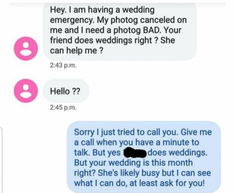 Some human beings are possessed by such profound levels of entitlement that it throws them onto a different wavelength, altogether. Take this bridezilla, for instance. She's being met with a helpful and understanding enough attitude by her "friend", but proceeds to kind of trash the moment by waving her lazy entitlement all over the place.