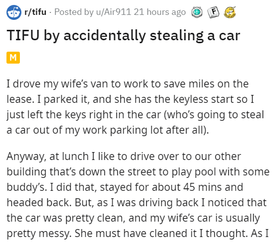 How many tales of mistaken identity end with accidentally stealing someone's car for 45 minutes? This guy noticed something was off after he noticed the car seats. Good thing there weren't any kids in them. People make incredibly stupid mistakes all the time, like this woman who had groceries delivers and failed all over the place.
