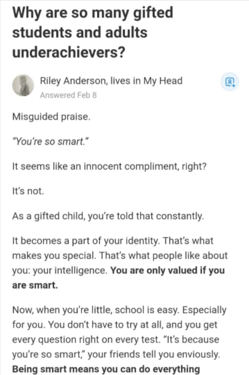 Some folks might connect with this Quora post that aims to break down the implications of the assigning the word smart to different individuals. Seems like there are a whole lot of "gifted students" out there that suffered the fallout of fielding so much pressure at a young age, just cause tests in class were a bit easier.