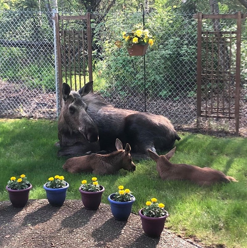 Adorable Moose And Her Two Calves Camp Out In A Backyard