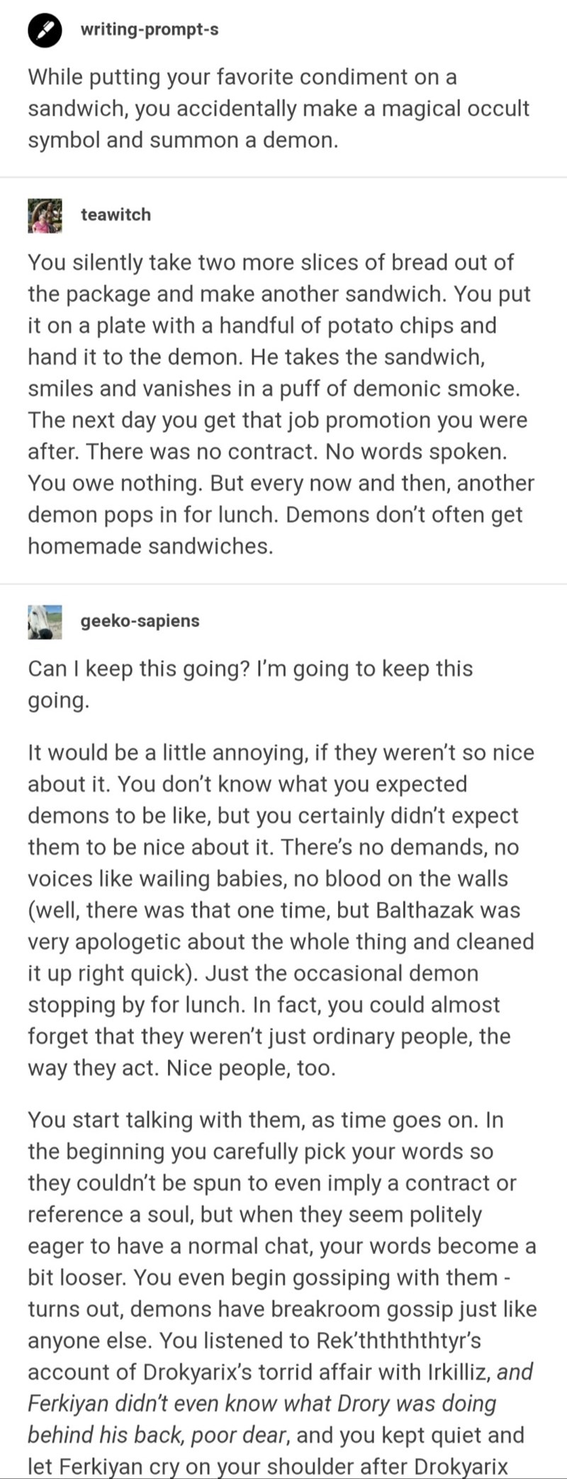 We're not usually ones for zany Tumblr writing prompt threads, but this one is an exception. It encapsulates everything we love about quirky Tumblr. The story starts from the point of view of someone simply making a sandwich. After accidentally drawing a magical symbol with condiments, a demon is summoned to your home. And somehow manage to quell his demonic rage by making him a sandwich of his own. He likes it so much he returns with other demons. The rest is a creative, imaginative and kinda wholesome whirlwind. And it's all below.