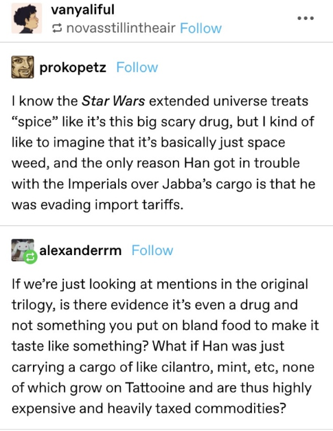 With a lot of additions to the Star Wars universe, and the directive that Star Wars should be okay for kids, there was some internal confusion over what "spice" is or does. That is of course until a certain writer had a hilariously direct conversation with George Lucas. People have made some other very humorous and poignant observations on Star Wars, like how Darth Vader is so extra, or this Star Wars fan calling out people's complaints. And for good measure here's a twitter thread on how different Star Wars characters take their coffee.