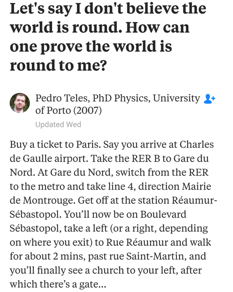 Text - Let's say I don't believe the world is round. How can one prove the world is round to me? Pedro Teles, PhD Physics, University &+ of Porto (2007) Updated Wed Buy a ticket to Paris. Say you arrive at Charles de Gaulle airport. Take the RER B to Gare du Nord. At Gare du Nord, switch from the RER to the metro and take line 4, direction Mairie de Montrouge. Get off at the station Réaumur- Sébastopol. You'll now be on Boulevard Sébastopol, take a left (or a right, depending on where you exit)
