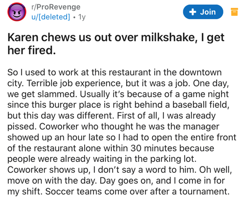 Karen should've just played nice, but no, she had to go and chew out a hard working employee over a dang milkshake. Fortunately, the employee kept their wits about them, and after a little digging, was able to get Karen a rightful termination for her toxic antics. Check out some more Karen drama with this Karen who asked a man to mow her lawn for 10 bucks.