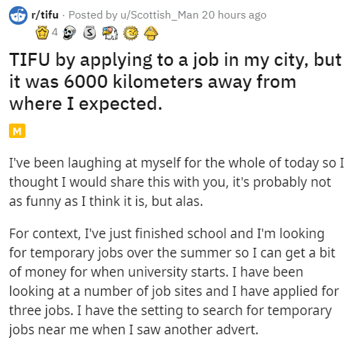 People are people and we make mistakes. Here's a dude who thought he was applying to a job in his own city, but low and behold, the listing was extremely easy to misread. For some more mix-ups, here's a guy who thought a date was a job interview and here's a woman who thought an office was a dog sitting company for months.