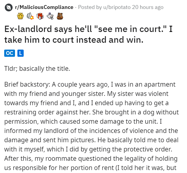 What a splendid little example of calling someone's bluff. This landlord was completely unhelpful and thought their threat would let them illegally keep their tenant's security deposit. After getting caught lying in court, this tenant had their ex-landlord eating their stupid words. People sometimes win against their landlords, like this guy who got contractual revenge on his landlord or this person who staged a coup d'etat on their terrible landlord.
