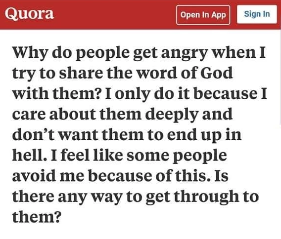 After asking an honest question about how this user didn't get why people were made uncomfortable by being preached at, they got an honest answer in the form of a lesson in group psychology, and the formation of in-groups and out-groups. For something more lighthearted, here are some absolutely insane quora questions, and here's a tumblr thread explaining the loopholes when it comes to holy water.
