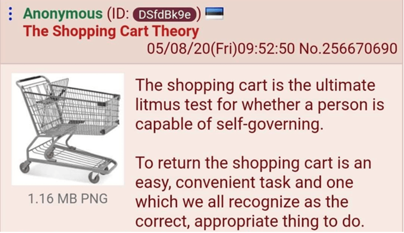 This quick and enlightening shopping cart theory aims to determine whether or not a person is good or bad. It boils down to whether or not a person decides to make the "right" choice when they are aware that nobody else is looking. Seems fair enough. Sometimes, it's not about that good act of wholesome kindness that you pull off when you know you'll receive recognition and praise. Instead, it can be a more pure reflection of your morality, when you're out there doing the right things without any inflation of your ego.