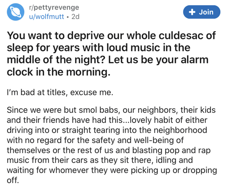 This is certainly not the first time that we've encountered a case of neighbors being loud and inconsiderate, and we doubt that it'll be the last. With that being said, this particular scenario brought into play some loud neighbors that insisted on being a sleep-robbing nuisance. So, the kids decided to be their personal, unwanted alarm clock. All in all, the perfect recipe for a successful petty revenge.