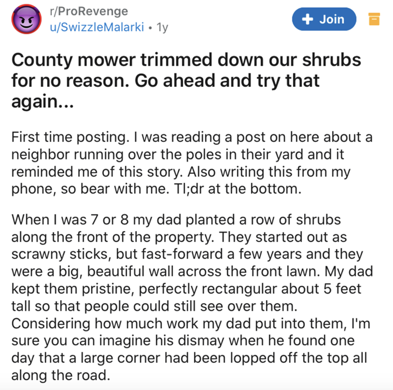 This tale of pro revenge involving an inconsiderate county mower and a dad who wasn't going to put up with anyone's nonsense reminds us of another revenge involving a steel-enforced mailbox and a snowplow. The grin on dad's face must've spanned from cheek to cheek. Sounds like the county mower was ultimately unsuccessful with trying to get dad to cough up cash for those broken blades too. Talk about the icing on the cake.