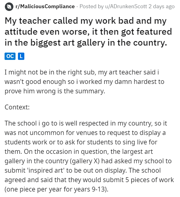 Sometimes teachers misjudge their students, like this teacher who underestimated their students during a social experiment. Other times, the powers that be can be mistaken and disrespectful, like this staff who made a student wait to report a fire. In this case, it was an art teacher who was soundly put in their place after handing down some harsh criticism. Art is subjective, anyway.