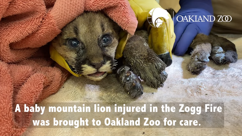 The Oakland Zoo reported a few days ago about a 4-6 week-old mountain lion cub being brought into their care. The lion was discovered by a Cal Fire firefighter in Redding in an area that the fire burned through. The firefighter immediately contacted the Shasta County Sheriff's Department who then contacted the California Department of Fish and Wildlife (CDFW). Following that, the CDFW contacted the Oakland Zoo veterinarians. It was a team effort in which everyone had the best of intentions, wanting to save the poor cub, and thankfully, that effort payed off.