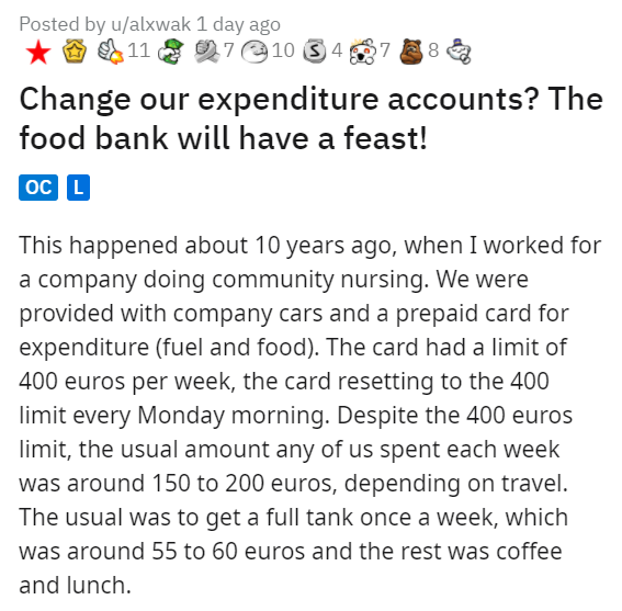Chad decided to make all the employees situation inconvenient in order to try and save some money, but he ended up costing more money for the company in the end. The employees spoke their mind through charity. For another weird budget story, here's a Karen who used up her entire budget on ugly PowerPoints.