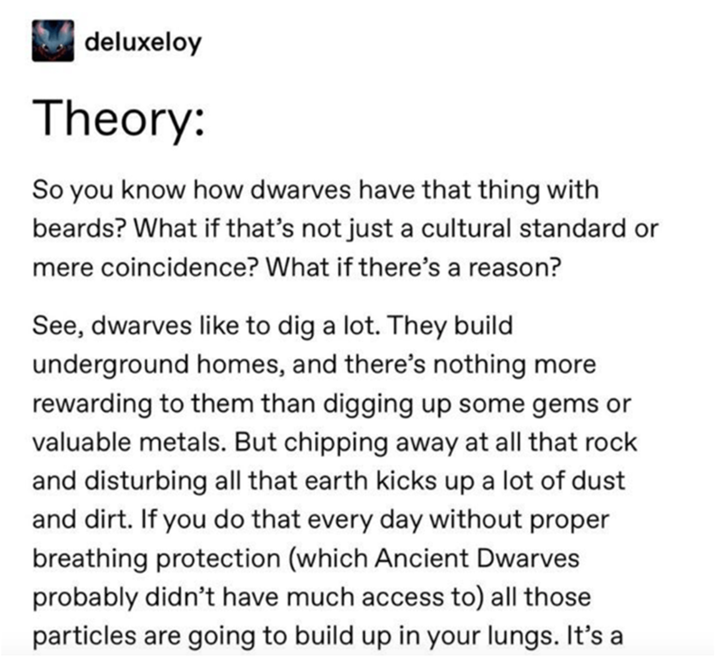 This is why we cherish Tumblr. The denizens of Tumblr will take what is essentially a total non-issue, break it down into its constituent parts, break it down further, pull it inside out, and put it back together like your estranged cousin with his favorite VCR. We have phenomenal human beings that take things to the furthest extent: like why dwarves have the most, undeniable, impressive beards that any world has ever seen. It's a beautiful thing, the theories that a rapidly spinning mind will come up with.
