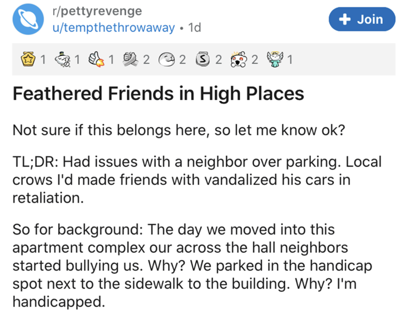 This is why you don't mess with crows, or better yet, why it pays off to have some feathered friends in high places. This guy's neighbors sound like they were a real piece of work, and generally unfortunate people to be around. Fortunately, he was able to befriend some crows that would appear to have picked up wind of this, and proceeded to stand up for him. With all the wild stories of people's experiences with intelligent, devilishly clever crows, it's really no big surprise.