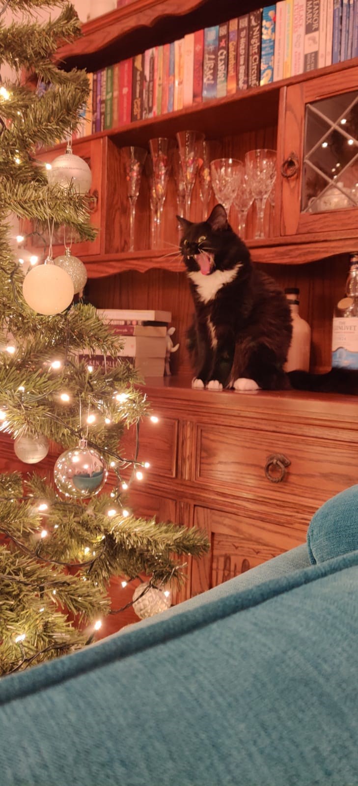 "Heard a rustling and see I have a new ornament in the tree. It’s her first Christmas. Glad I got plastic ornaments!"