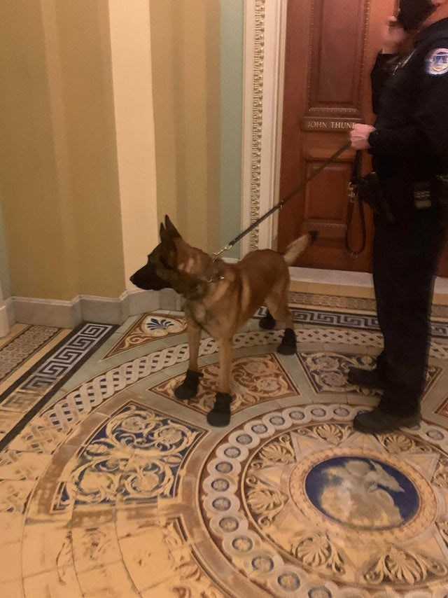 "A friendly bomb sniffing pupper at Congress wearing booties to protect his paws from broken glass"
