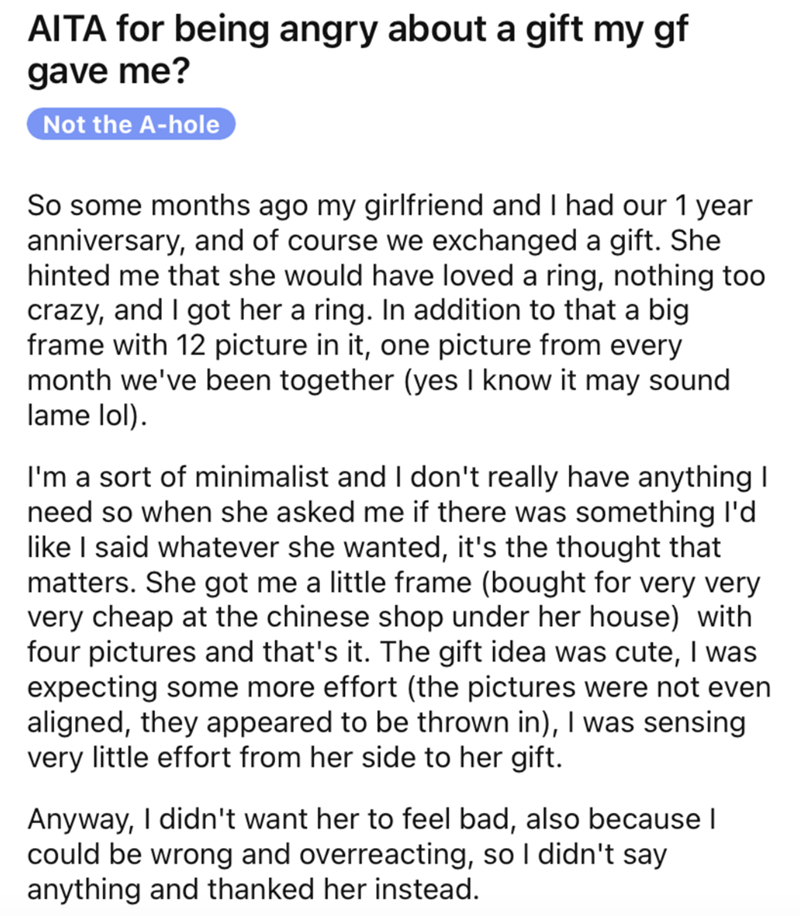 Girlfriend Spends Minimal Effort On Boyfriend's Gift, Boyfriend Gets Sad