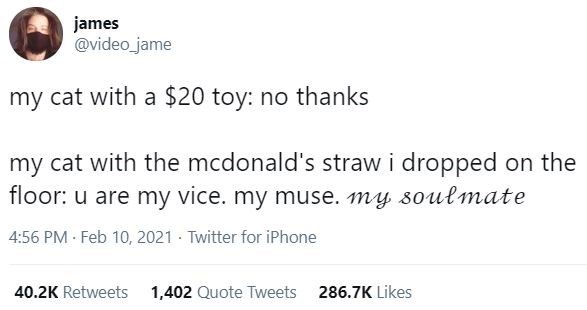 One of my cats ultimate favorite 'toys' is a crumpled up small piece of paper. That's it. Just pick any used piece of paper, crumple it up, toss it in the air, and my chonker will go flying after it like nothing else. Literally nothing else. It's amazing to watch, actually, it's basically the only exercise she's ever willing to do.