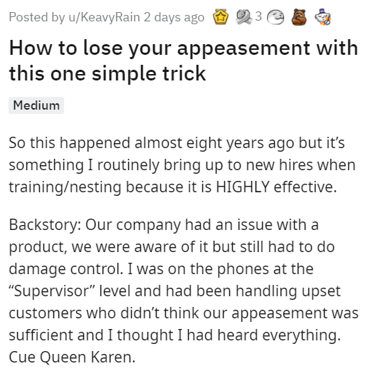 Karen thought she could get through on a lie, but had another thing coming when tech support got wise to her BS. For a more direct approach, here's a boss who used an eye gag to remove some problem customers. And sometimes, fellow customers join in, like this customer who weaponized the tip jar to defeat a Karen.