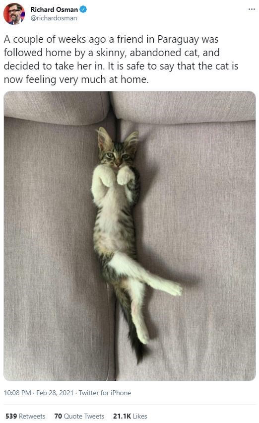 This is officially the cutest kitten photo we've seen today, and we see many of them. That, accompanied with the wholesomeness and pure goodness of the tweet has managed to bring a smile to our face like no other. There is nothing better than happy rescued animals. Nothing at all, and we are so happy that your friend made the decision that they did, because this is one happy rescued kitten.