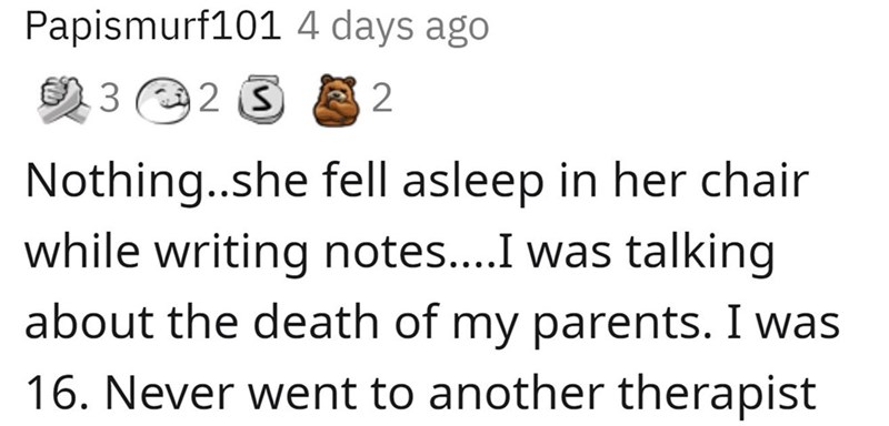 Nothing makes you feel quite as crap than sitting across from someone as you pour your heart out to them, only to have them FALL ASLEEP. Honestly, after an experience like this, I don't think I'd go to another therapist either!