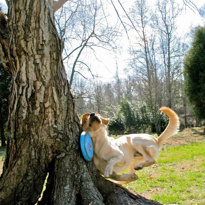 Such a perfectly captured moment. We can only be grateful for the impeccable timing. We can imagine the speed and joy with which this pup was running toward this frisbee, the jump into the air, ever so slightly miscalculated within all the excitement of the moment, and the consequential landing. Heck. Almost perfect.