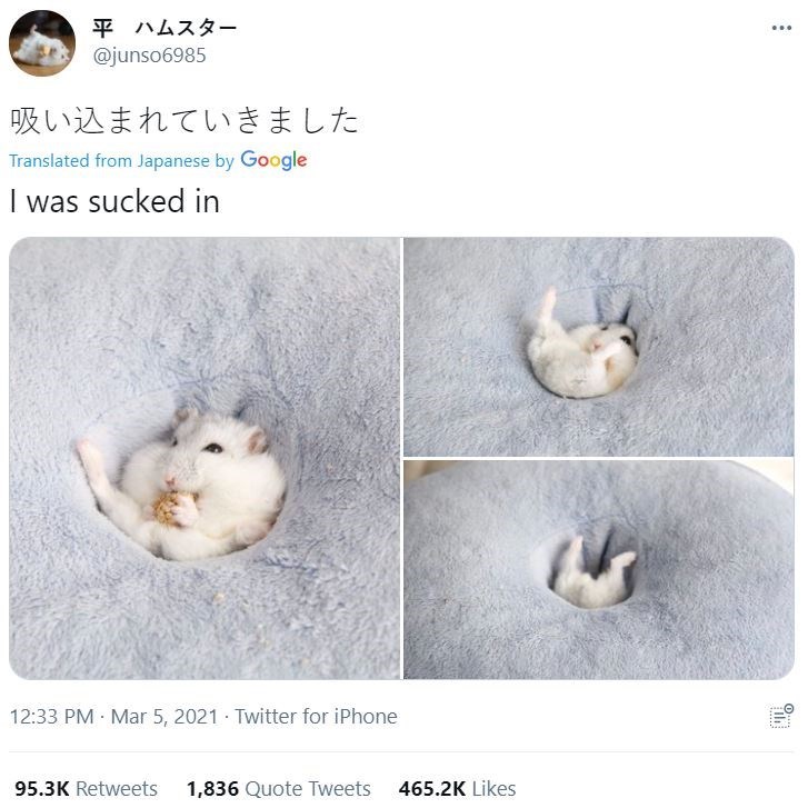 One doesn't need to understand Japanese to be able to love and appreciate this awwdorable hamster. Three pictures of the perfect progression, perfectly timed- the face, changing from chill, to mildly panicked understanding to disappearing into a black hole. don't worry though, no hamsters were harmed in the taking of these pictures.