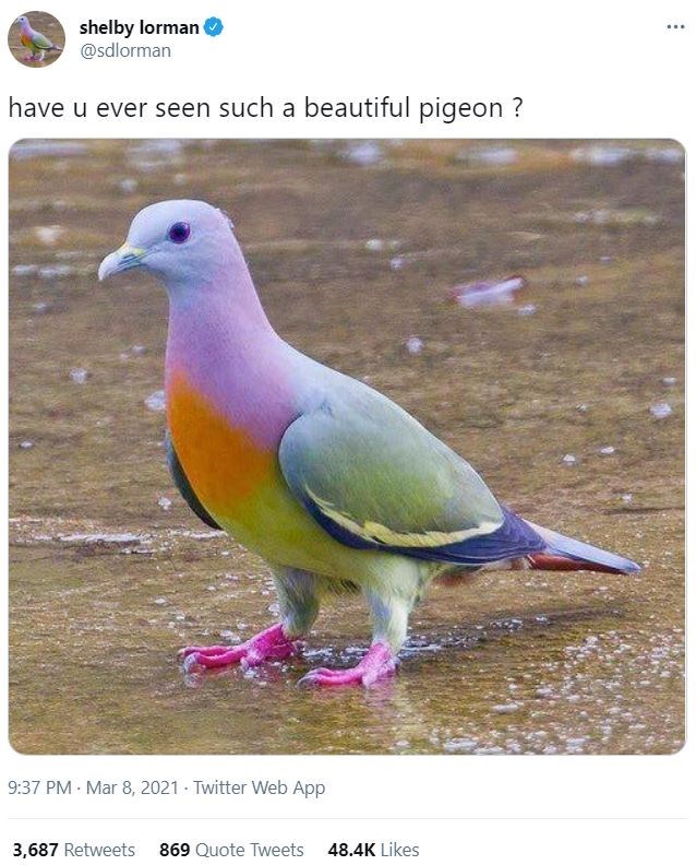 No, we have not. And thank you for introducing us to them. We honestly thought that this picture was fake at first. With the different colors of the torso plus the vibrant pink of the feet on the generally common-shaped looking pigeon. How can a pigeon be this beautiful? But it's real, and it's amazing.