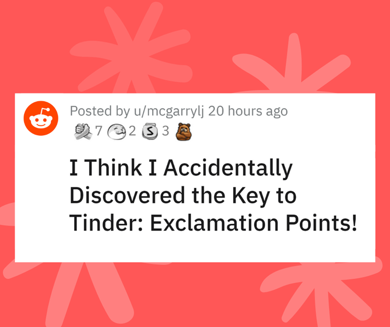 Reddit user u/mcgarylj decided to share how he 'accidentally' realized a true key to being successful on Tinder: Exclamation Points!