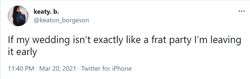 Girl, I feel you on this one! If it doesn't get as out of hand as a frat party, what's even the point? I didn't save up for an open bar for my wedding not to be lit. BRB, adding all the washed-out frat bros from my college days to the guest list to ensure a jolly good time.
