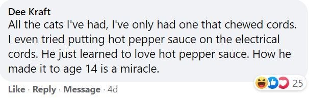 01It really is amazing how persistent they can be. My cat, thankfully, grew out of chewing cords, but goodness knows that she finds other ways of driving me crazy. If we could only get some of the force of will and persistence that they have, we would be able to get so much further in life.