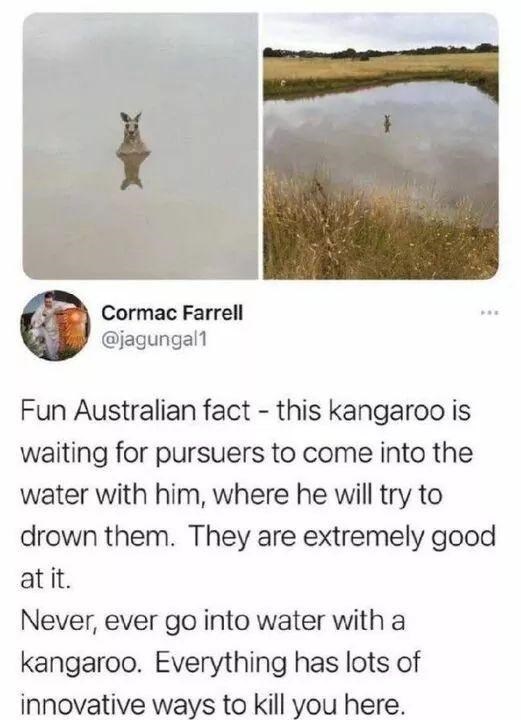 Knowing that kangaroos don't actually look like the most adorable, wholesome little beings from children's books, this is even more scary, honestly. It's like a tank waiting for you in the water - a jumping tank. A jumping tank that apparently can also drown you without resorting to kicking you in the face with its intense legs.