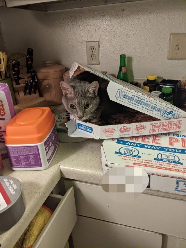 Honestly, as a cat owner, you should have known better. It is a known fact that cats absolutely love pizza boxes. They're warm, they smell good, they're the purrefct seat and the purrefct snack at the same time. 2 minutes were clearly two minutes too long, and we're proud of this cat for using this time wisely and getting what it wanted.
