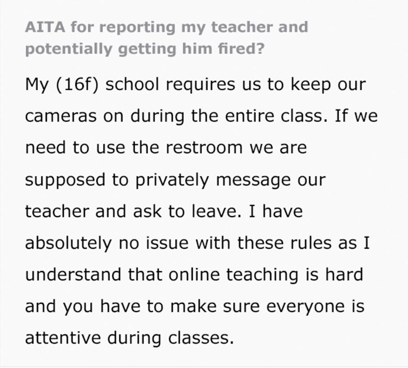The 16-year-old, aka u/PizzaPepparoni, explains the context behind the situation. She was fully aware of the rules during class and feels for her teachers who are forced to teach remotely.