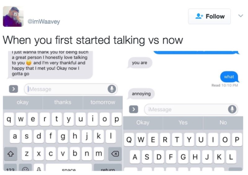 It's so fun to think about how a relationship develops throughout time. You're so polite in the beginning and then before you know it your farting in front of them and all the texting emojis disappear.