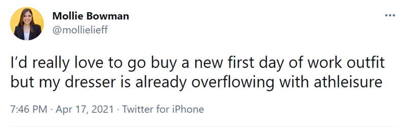 This Twitter user will hold onto her athleisure wear until the day she dies. Based on this hardcore attitude, she just might ask to be buried in athleisure too. Sounds like a pretty comfy way to go if you ask me.